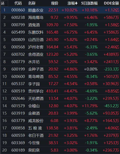 從早盤表現(xiàn)強(qiáng)勢的飲料制造行業(yè)看,截至11月1日11:30,該行業(yè)交易中的47只個股有46只上漲,占比97.87%,其中8只漲幅超5%。從資金流向看,該行業(yè)今天上午大單資金凈流入額達(dá)22.73億元,居行業(yè)第2位。