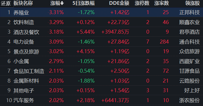 同花順行業(yè)方面,截至11月1日11:30,76類行業(yè)中65類上漲,占比85.53%,其中,養(yǎng)殖業(yè)、飲料制造、酒店及餐飲、電力設(shè)備、景點(diǎn)及旅游等行業(yè)漲幅居前,均超3%。下跌的行業(yè)中,醫(yī)療器械居首,跌幅達(dá)1.63%。