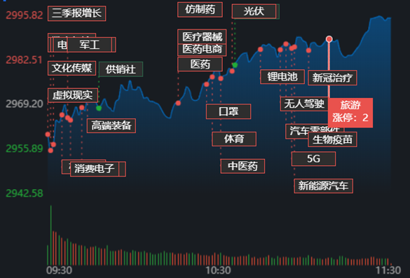 11月2日早盤,A股市場三大指數(shù)低開后震蕩走高,創(chuàng)業(yè)板指漲幅最大。截至上午11:30,上證指數(shù)漲0.88%,報2995.26點(diǎn);深證成指和創(chuàng)業(yè)板指漲幅分別為1.10%和1.41%;滬深兩市合計成交額6077.9億元,較前一交易日增長2.86%??傮w來看,A股市場個股漲多跌少,有73只個股漲停,跌停個股1只。