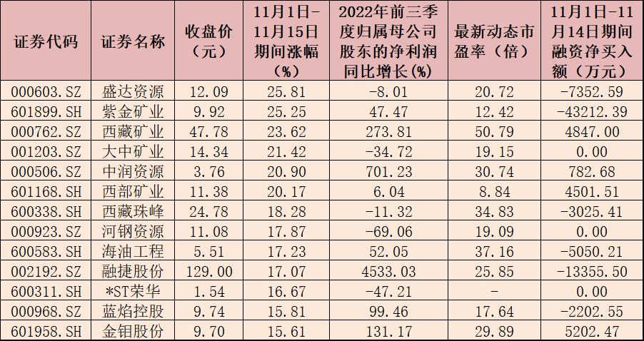 表:11月1日至11月15日期間漲幅超15%的采礦板塊內(nèi)個股一覽