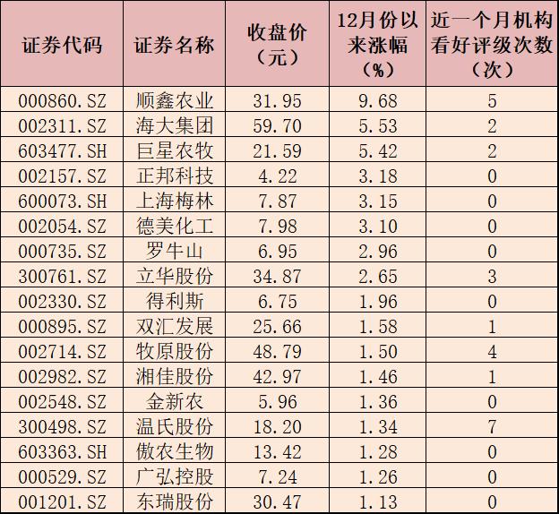 表:12月份以來漲幅超1%的豬肉概念股一覽