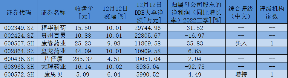 表:12月12日,獲大單資金凈流入額超5000萬元的中藥板塊個(gè)股一覽