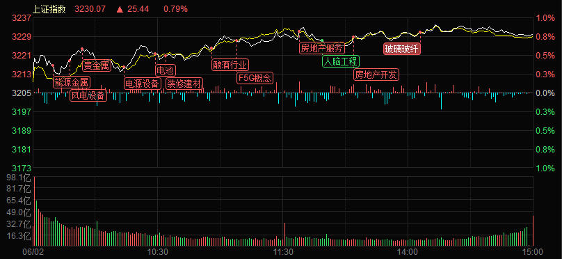6月2日,A股三大股指高開高走,權(quán)重藍(lán)籌表現(xiàn)強(qiáng)勢(shì),上證50指數(shù)大漲超1.7%,滬指成功收復(fù)年線,兩市呈深強(qiáng)滬弱格局。截至收盤,上證指數(shù)漲0.79%報(bào)3230.07點(diǎn);深證成指漲1.50%報(bào)10998.07點(diǎn),創(chuàng)業(yè)板指漲1.22%報(bào)2233.27點(diǎn),A股合計(jì)成交額9421.04億元,較前一交易日縮減4.67%;北向資金全天凈買入85.34億元;其中滬股通凈買入31.30億元,深股通凈買入54.04億元。今日A股漲多跌少,有3400只上漲,1599只下跌。
