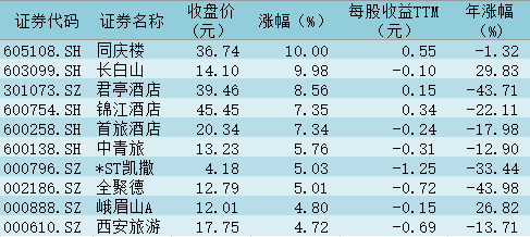 表:酒店及餐飲、景點(diǎn)及旅游板塊漲幅前十個(gè)股一覽