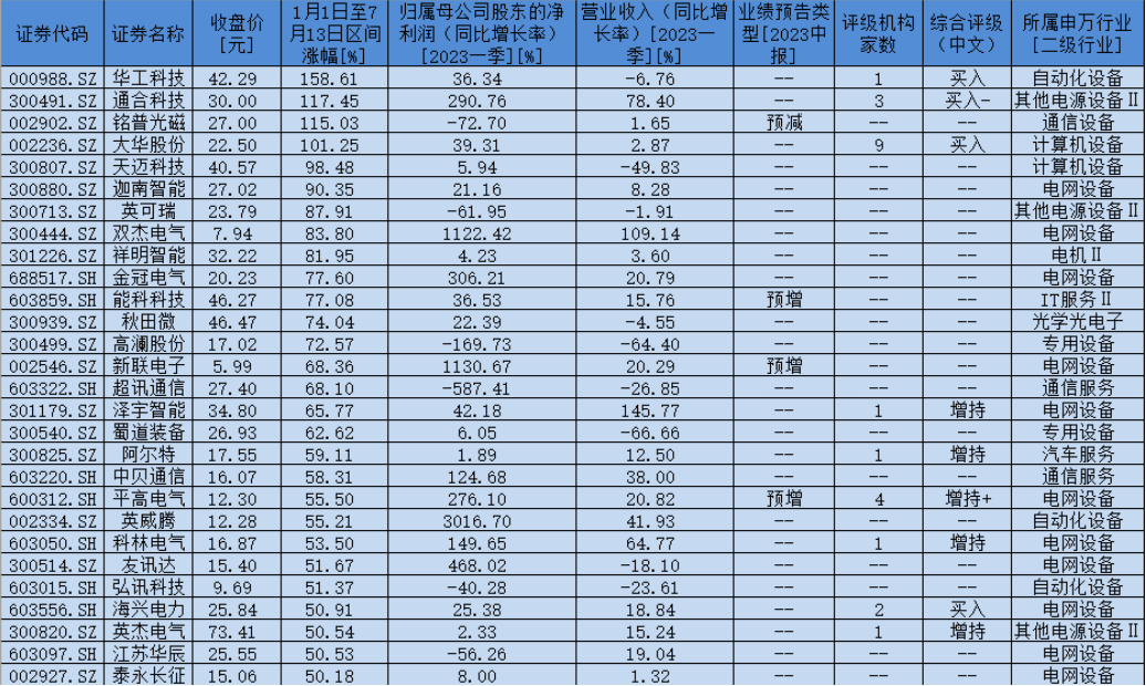 表:1月1日至7月13日,充電樁概念板塊個(gè)股漲幅超50%個(gè)股一覽