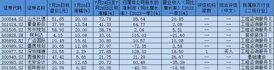 表:7月24日至7月26日,建筑裝飾行業(yè)期間累計漲幅超20%個股一覽