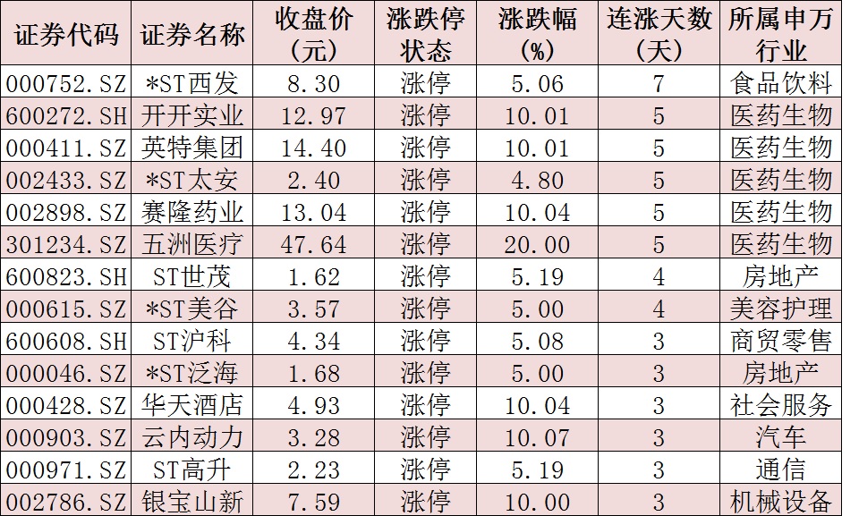 表:連續(xù)上漲3日且今日收盤漲停個(gè)股情況: