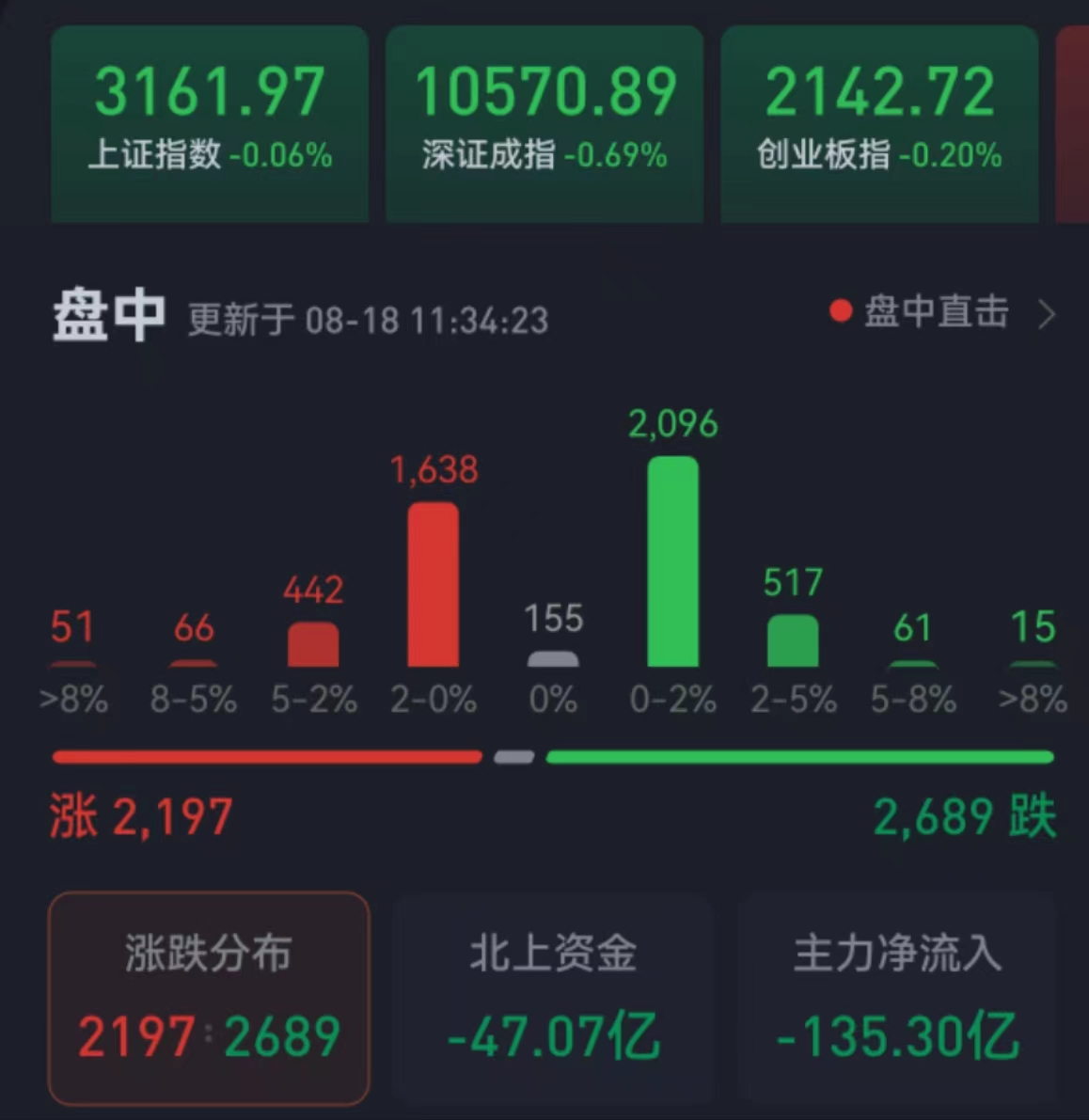 周五(8月18日)三大股指震蕩整理。截至上午收盤(pán),上證指數(shù)跌幅達(dá)0.06%,報(bào)3161.97點(diǎn);深證成指和創(chuàng)業(yè)板指跌幅分別為0.69%和0.20%;滬深兩市合計(jì)成交額4474.1億元,總體來(lái)看,兩市個(gè)股跌多漲少,其中,漲停個(gè)股達(dá)38只,跌停個(gè)股有1只。