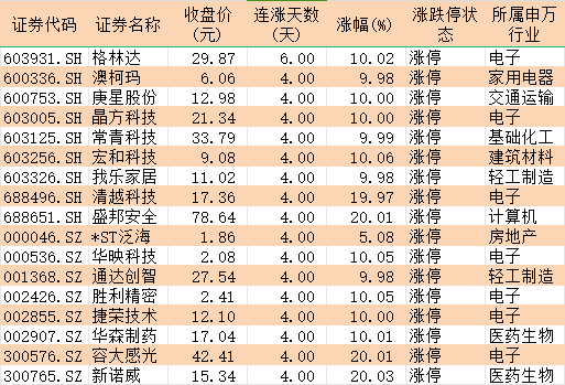 表:今日以漲停價(jià)報(bào)收且連續(xù)上漲4日以上的個(gè)股一覽