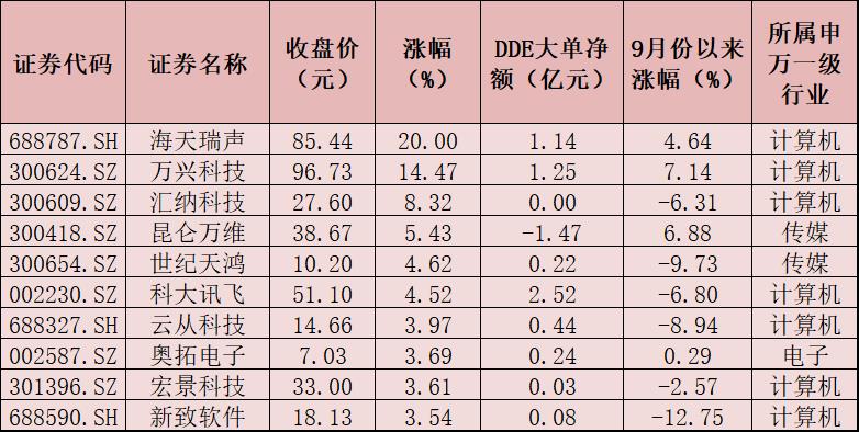 ChatGPT概念股也獲得市場大單資金的青睞。9月26日,有48只概念股獲市場大單資金凈買入,合計(jì)凈買入額為13.48億元。其中,科大訊飛、鴻博股份、萬興科技、海天瑞聲、三六零等5只概念股獲大單資金凈買入額均超1億元。
