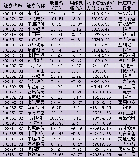 資金方面,北向資金3日均呈流出狀態(tài),累計(jì)凈賣出金額達(dá)65.57億元。從前十大成交活躍股來(lái)看,本周,貴州茅臺(tái)、陽(yáng)光電源、中國(guó)建筑、平安銀行等4只個(gè)股,北向資金凈買入金額均超5億元。另外,恒瑞醫(yī)藥、贛鋒鋰業(yè)等個(gè)股遭北向資金凈賣出金額均超5億元。