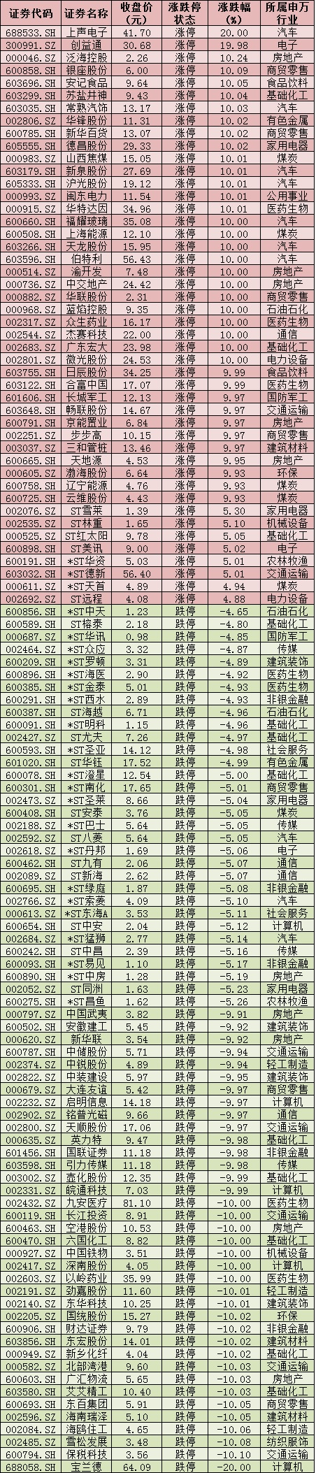 周五(4月15日)漲跌停個股情況: