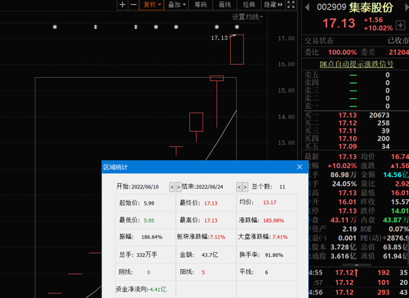 6月24日集泰股份再度漲停,已連收11個(gè)漲停板。截至收盤(pán),該股報(bào)17.13元,換手率24.05%,成交額14.56億元,總市值63.85億元。6月10日至今,集泰股份累計(jì)漲幅達(dá)185.98%。