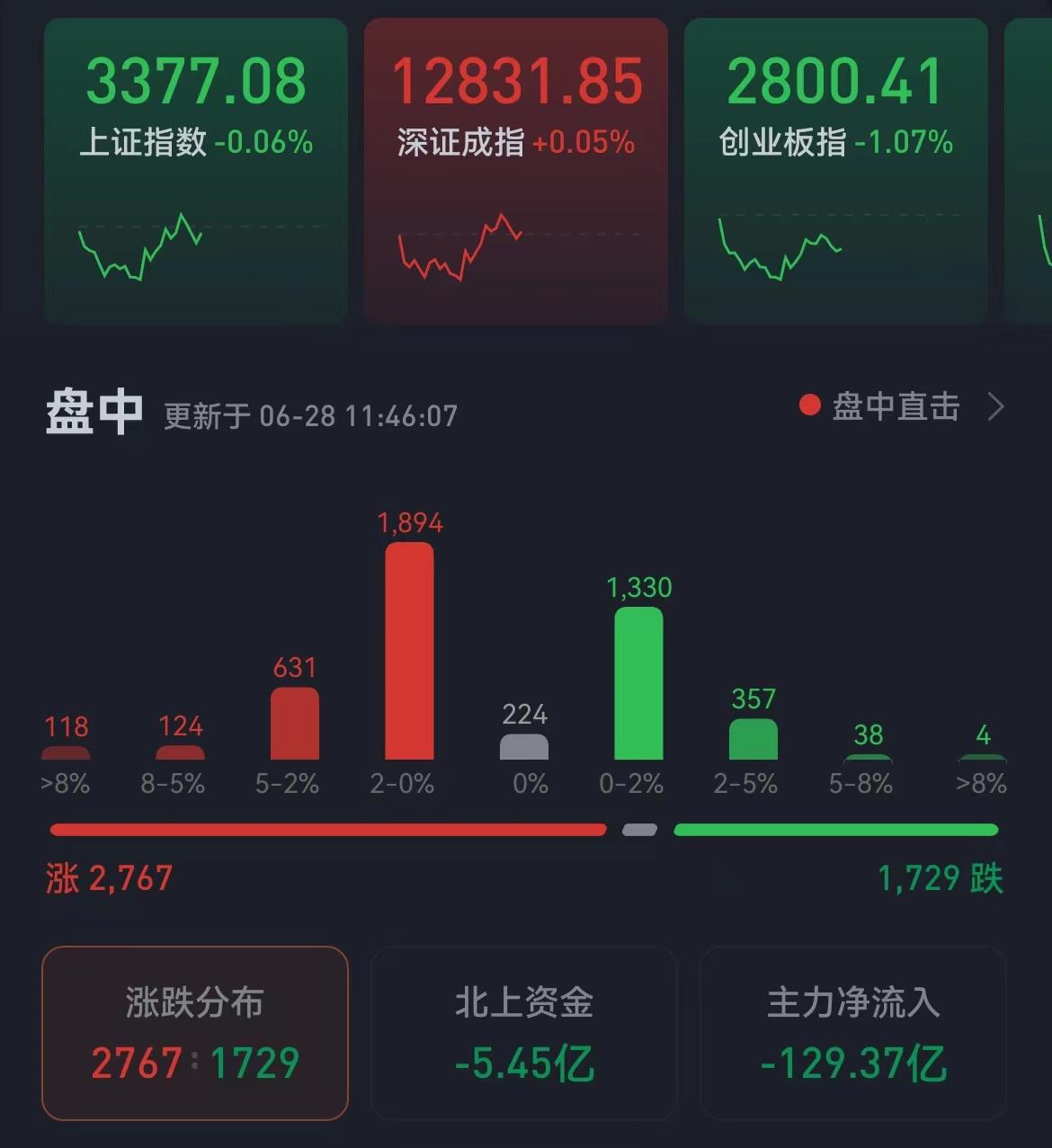 周二(6月28日),三大股指震蕩分化。截至上午收盤,上證指數(shù)微跌0.06%,報3377.08點;深證成指微漲0.05%,創(chuàng)業(yè)板指跌幅為1.07%;滬深兩市合計成交額7008.5億元;總體來看,兩市個股漲多跌少。