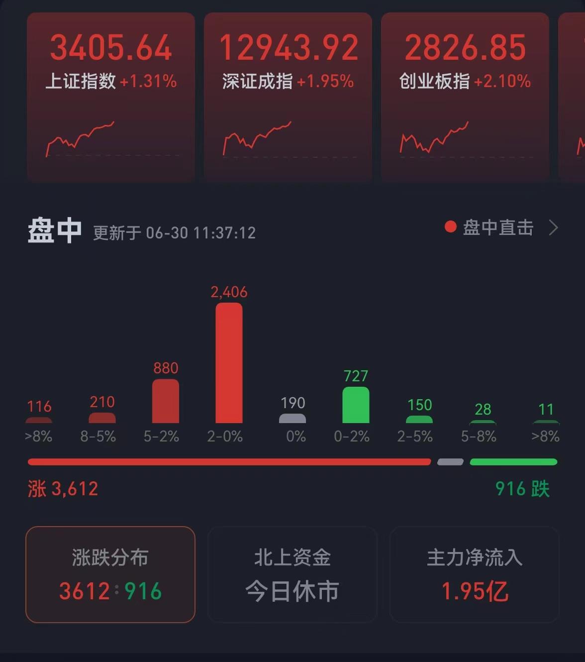 周四(6月30日),三大股指震蕩上揚(yáng),全線飄紅。截至上午收盤,上證指數(shù)漲1.31%,報(bào)3405.64點(diǎn),重新站上3400點(diǎn)整數(shù)關(guān)口;深證成指和創(chuàng)業(yè)板指漲幅分別為1.95%和2.1%;滬深兩市合計(jì)成交額6922.7億元;總體來看,兩市個(gè)股漲多跌少,上漲個(gè)股達(dá)3612只,僅有916只個(gè)股下跌。