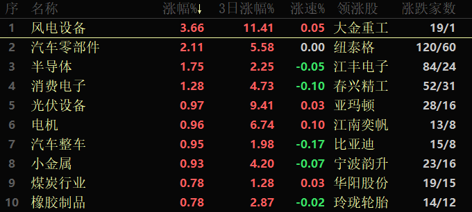 東方財(cái)富行業(yè)方面,截至7月15日11:30,86類行業(yè)中有25類上漲,占比29.07%。風(fēng)電設(shè)備行業(yè)居漲幅榜首,漲幅達(dá)3.66%,此外,汽車零部件行業(yè)漲幅也超2%;跌幅居首的行業(yè)是房地產(chǎn)開(kāi)發(fā),下跌3.42%。