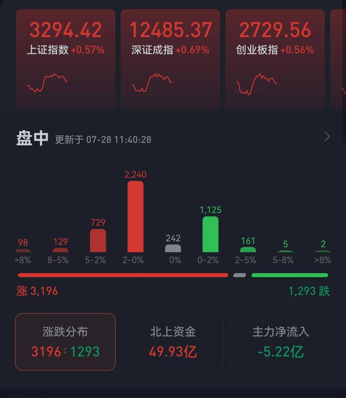 周四(7月28日),三大股指震蕩攀升,全線飄紅。截至上午收盤,上證指數(shù)漲幅達(dá)0.57%,報(bào)3294.42點(diǎn);深證成指和創(chuàng)業(yè)板指漲幅分別為0.69%和0.56%;滬深兩市合計(jì)成交額6316.1億元??傮w來看,兩市個(gè)股漲多跌少。
