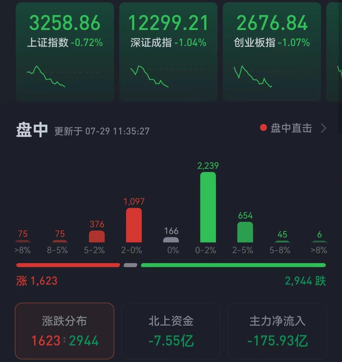 周五(7月29日),三大股指震蕩回落。截至上午收盤(pán),上證指數(shù)跌幅達(dá)0.72%,報(bào)3258.86點(diǎn);深證成指和創(chuàng)業(yè)板指跌幅分別為1.04%和1.07%;滬深兩市合計(jì)成交額6223.8億元,總體來(lái)看,兩市個(gè)股跌多漲少。