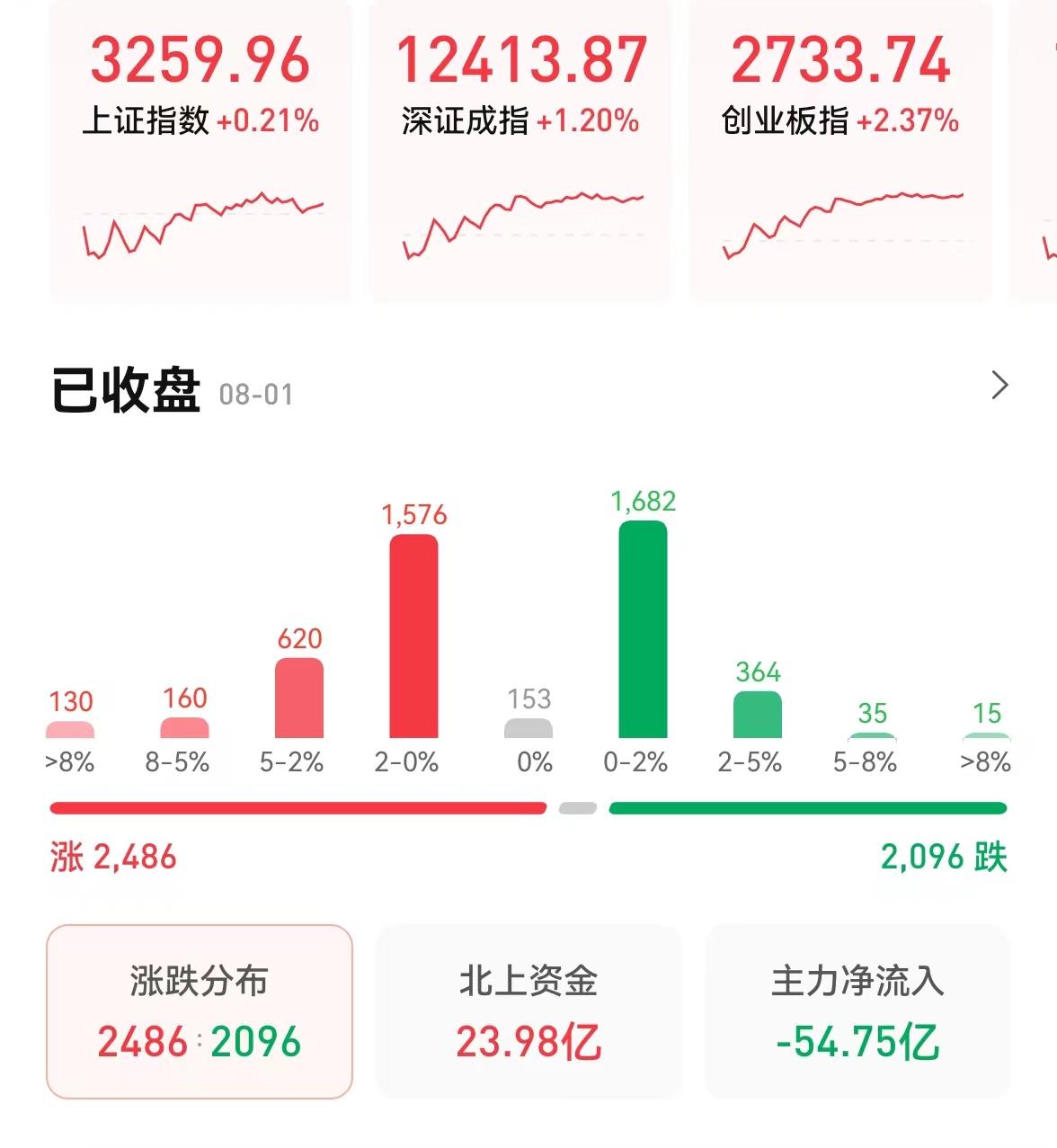 截至8月1日收盤,上證指數(shù)漲0.21%報(bào)3259.96點(diǎn),深證成指漲1.2%報(bào)12413.87點(diǎn),創(chuàng)業(yè)板指漲幅達(dá)2.37%報(bào)2733.74點(diǎn);兩市合計(jì)成交9939億元,北向資金凈買入23.98億元??傮w來(lái)看,A股個(gè)股漲多跌少。