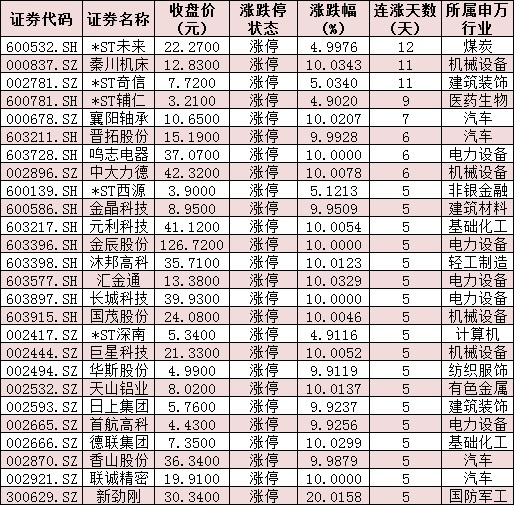 表:今日漲停且連漲5日以上的個(gè)股情況: