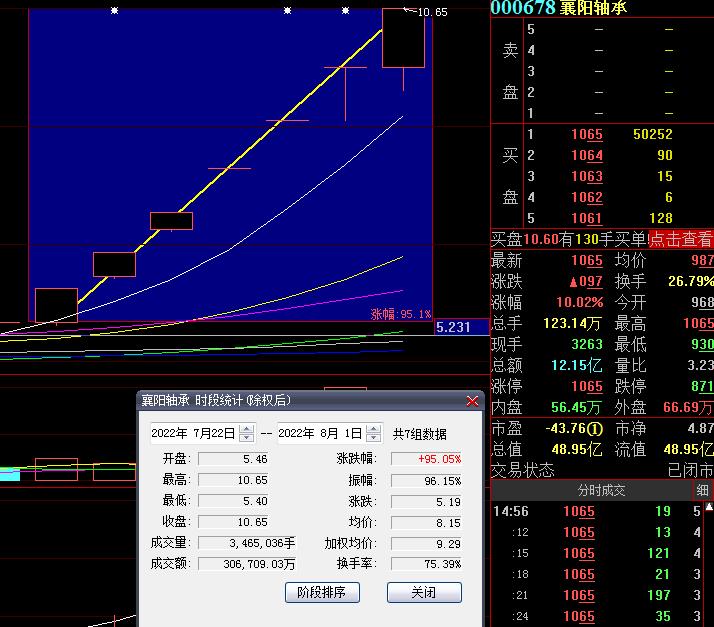 8月1日,熱門股襄陽(yáng)軸承再度漲停,截至收盤,報(bào)10.65元,實(shí)現(xiàn)7連板累計(jì)漲幅達(dá)95.05%。