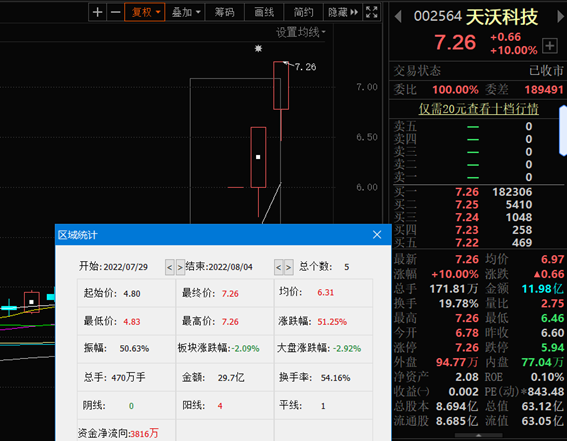 8月4日,天沃科技漲10.00%,報(bào)7.26元。該股自7月29日以來,截至8月4日已連續(xù)5個(gè)交易日上漲,累計(jì)漲幅達(dá)51.25%,最近的4個(gè)交易日實(shí)現(xiàn)連續(xù)漲停。