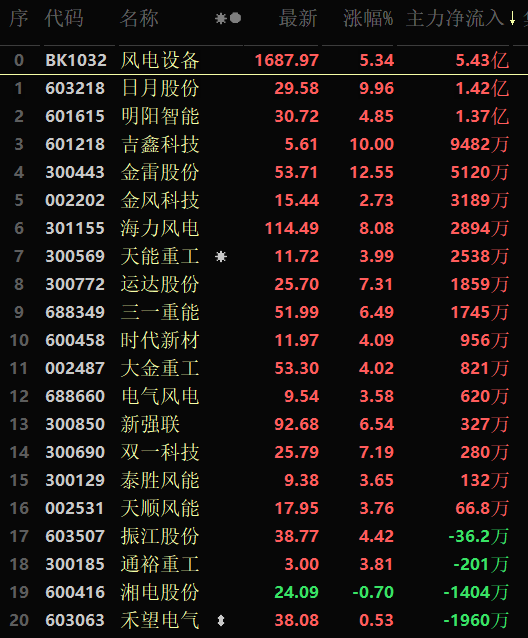 從漲幅居首的風電設備行業(yè)看,截至8月16日11:30,行業(yè)交易中的20只個股,有19只上漲,其中,有2只個股漲停。從資金流向看,風電設備行業(yè)今天上午大單資金凈流入額達5.43億元,居行業(yè)第6位。