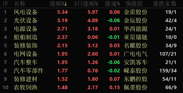 東方財富行業(yè)方面,截至8月16日11:30,86類行業(yè)中62類上漲,占比72.09%,其中,風電設備漲幅達5.34%,排名首位,此外,光伏設備、電源設備、船舶制造和裝修裝飾等行業(yè)漲幅也均超2%。下跌的行業(yè)中,采掘跌幅居首,跌幅達0.97%。