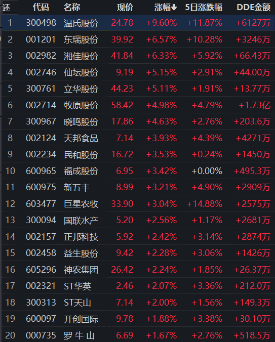 從漲幅居首的養(yǎng)殖業(yè)看,截至8月19日11:30,行業(yè)交易中的25只個股有24只上漲。從資金流向看,養(yǎng)殖業(yè)今天上午大單資金凈流入額達(dá)4.51億元,居行業(yè)第4位。
