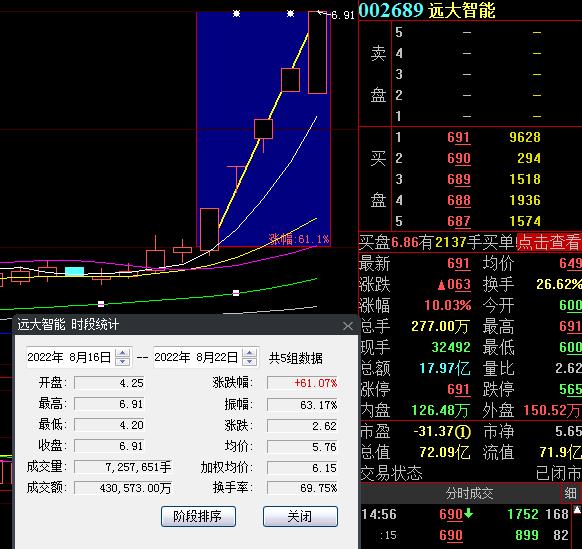 8月22日,熱門股遠(yuǎn)大智能再度漲停,截至收盤,報(bào)6.91元,實(shí)現(xiàn)5連板累計(jì)漲幅達(dá)61.07%。