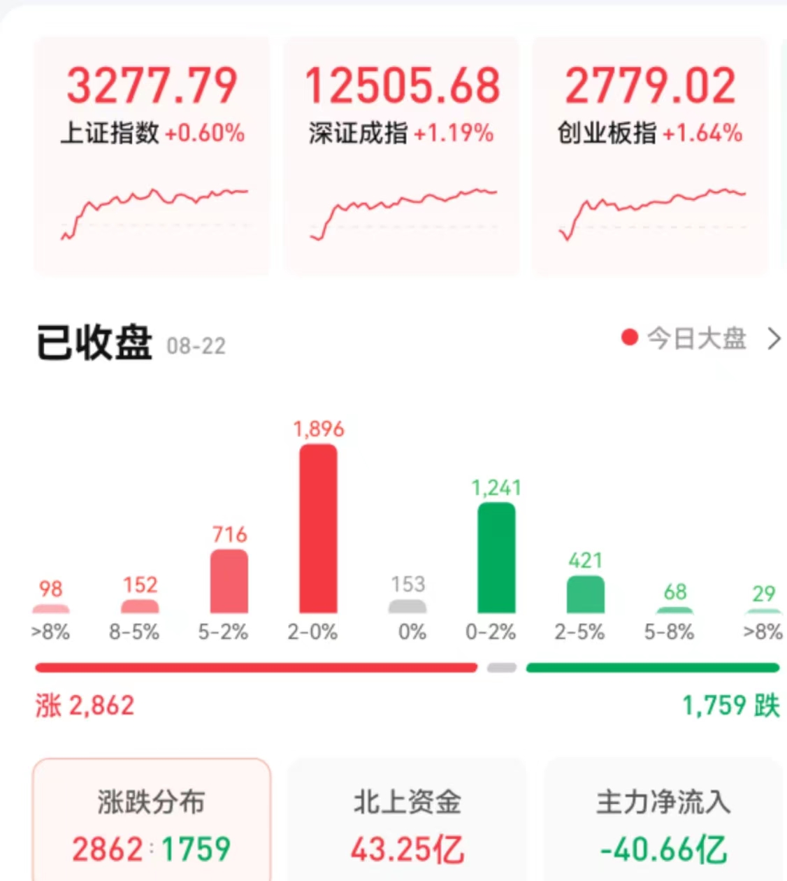8月22日,三大股指全線飄紅,截至收盤,上證指數(shù)漲幅達(dá)0.6%報(bào)3277.79點(diǎn),深證成指漲1.19%報(bào)12505.68點(diǎn),創(chuàng)業(yè)板指漲1.64%報(bào)2779.02點(diǎn);兩市合計(jì)成交10264億元,連續(xù)第5個(gè)交易日突破萬億元;北向資金凈買入43.25億元??傮w來看,A股個(gè)股漲多跌少。