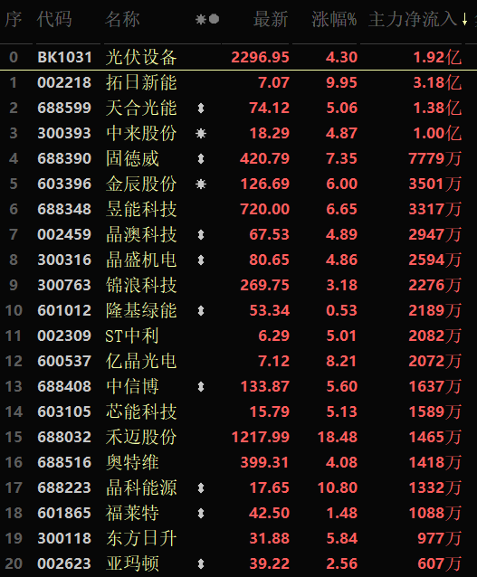 從漲幅居首的光伏設(shè)備行業(yè)看,截至8月29日11:30,行業(yè)交易中的47只個(gè)股有43只上漲,其中,有2只個(gè)股漲停。從資金流向看,該行業(yè)今天上午大單資金凈流入額達(dá)1.92億元,居行業(yè)第7位。