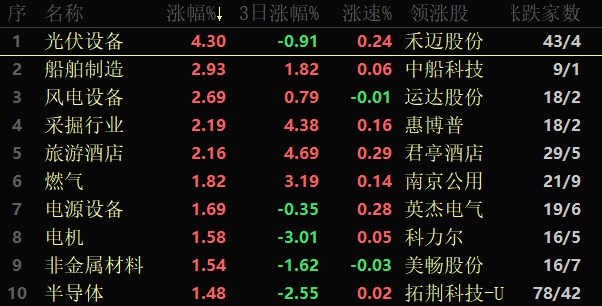 東方財(cái)富行業(yè)方面,截至8月29日11:30,86類行業(yè)中59類上漲,占比68.60%,其中,光伏設(shè)備漲幅達(dá)4.30%,排名首位,此外,船舶制造、風(fēng)電設(shè)備、采掘和旅游酒店等行業(yè)漲幅也均超2%。下跌的行業(yè)中,房地產(chǎn)服務(wù)居首,跌幅達(dá)1.34%。