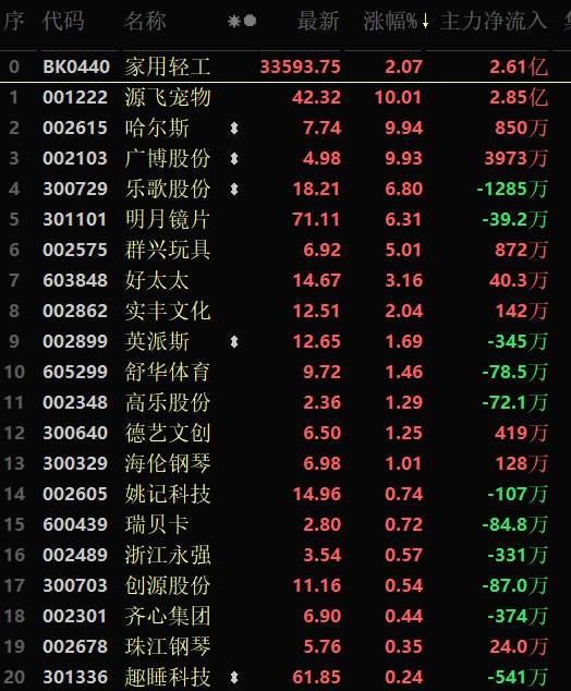 從漲幅居首的家用輕工行業(yè)看,截至8月30日11:30,行業(yè)交易中的27只個股有20只上漲,占比超七成。其中,有3只個股漲停。從資金流向看,該行業(yè)今天上午大單資金凈流入額達2.61億元,居行業(yè)第3位。