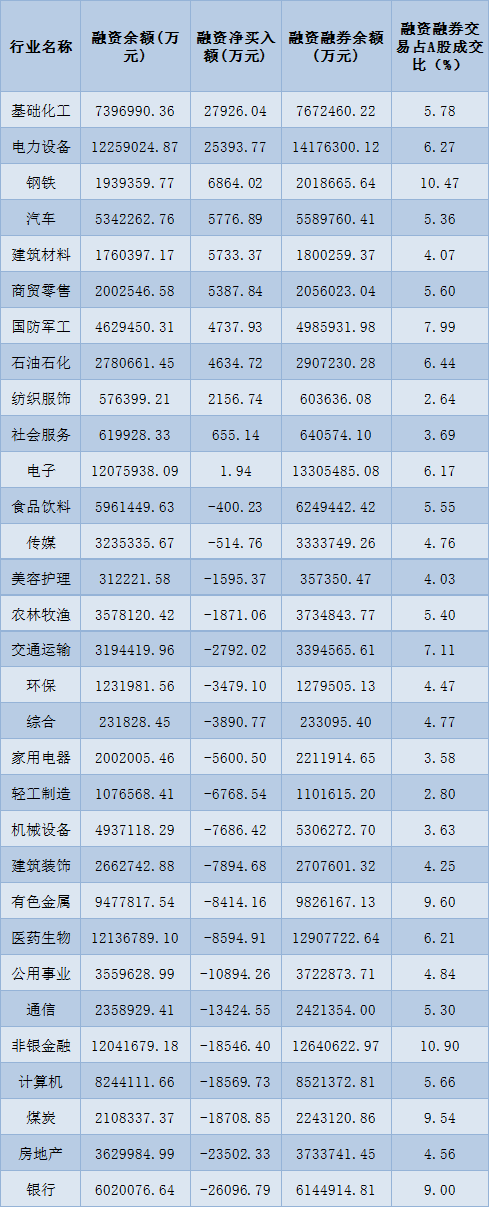 表:8月30日申萬一級(jí)行業(yè)兩融交易情況: