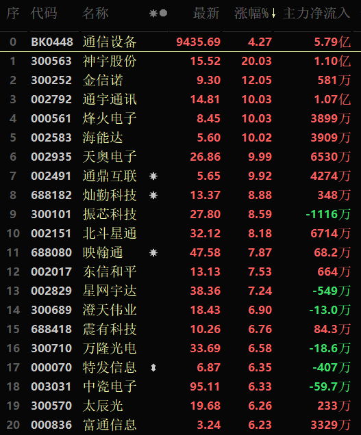 從漲幅居首的通信設(shè)備行業(yè)看,截至9月2日11:30,行業(yè)交易中的103只個(gè)股有98只上漲,其中29只漲幅超5%。從資金流向看,該行業(yè)今天上午大單資金凈流入額達(dá)5.79億元,居行業(yè)第2位。