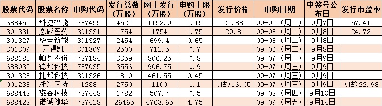 表:下周(9月5日-9日)10只新股發(fā)行情況: