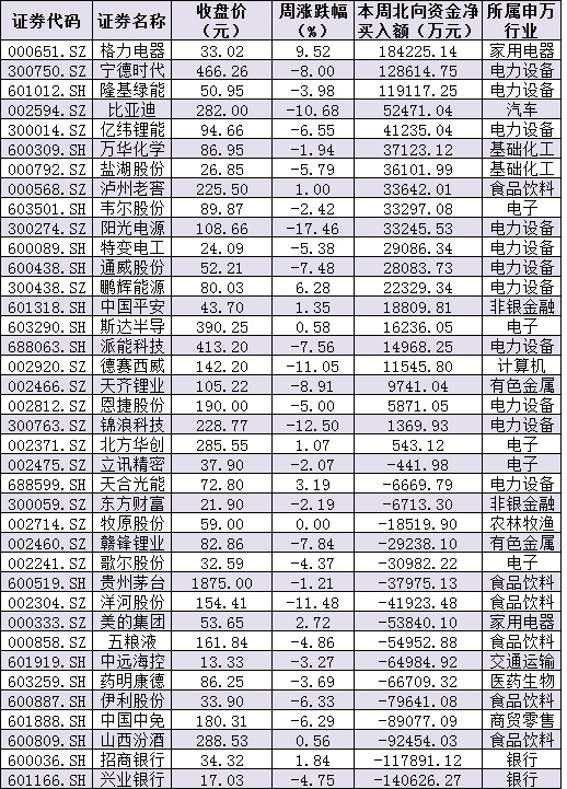 資金方面,北向資金本周累計凈買入金額達4.41億元。從前十大成交活躍股來看,本周,格力電器、寧德時代、隆基綠能等3只個股,北向資金凈買入金額均超10億元。另外,興業(yè)銀行、招商銀行等個股遭北向資金凈賣出金額均超10億元。
