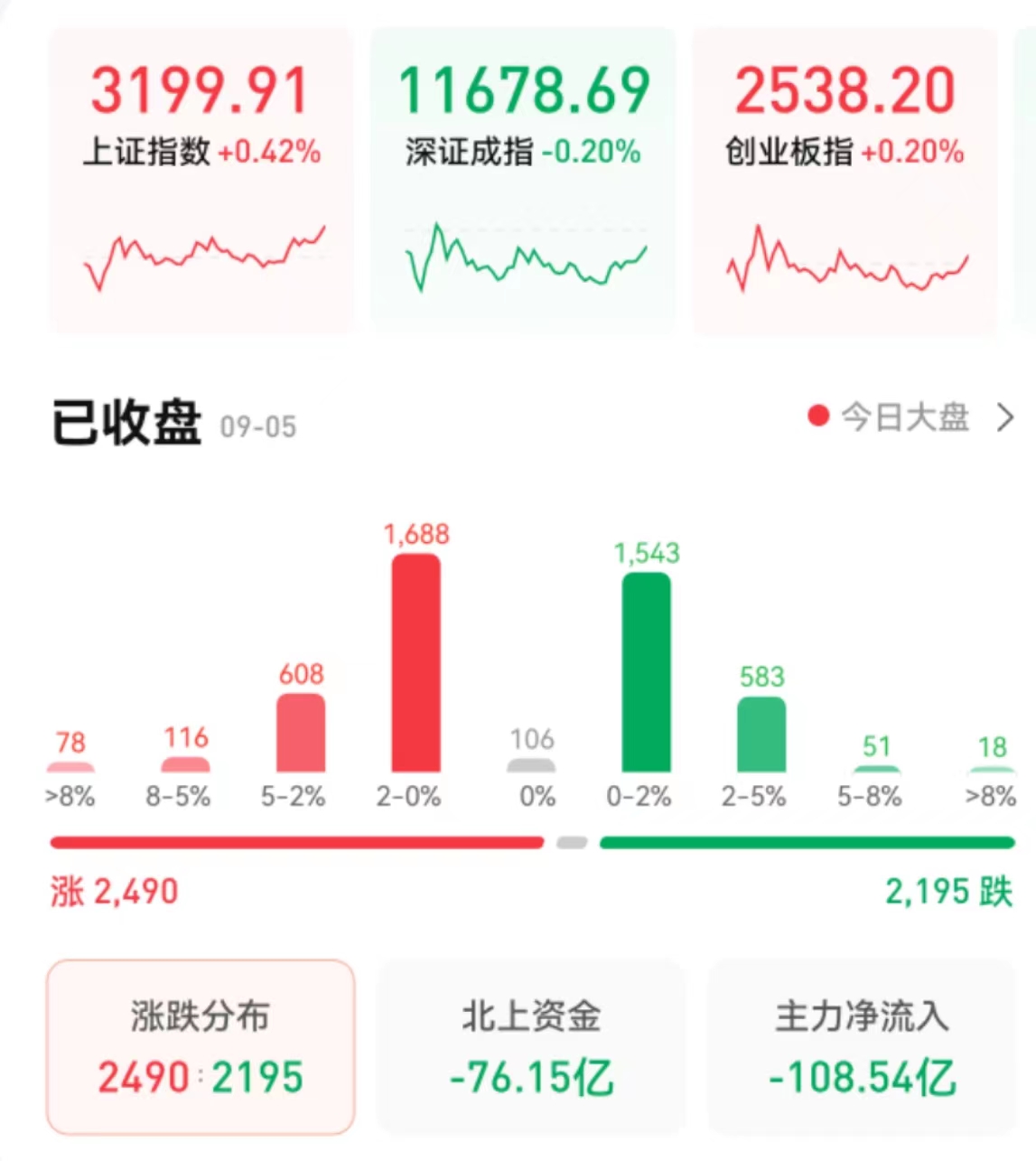 9月5日,A股三大指數(shù)震蕩分化,漲跌不一。截至收盤,上證指數(shù)漲幅達(dá)0.42%報(bào)3199.91點(diǎn),深證成指跌0.2%報(bào)11678.69點(diǎn),創(chuàng)業(yè)板指漲0.2%報(bào)2538.2點(diǎn);兩市合計(jì)成交7697億元,北向資金凈賣出76.15億元??傮w來看,A股個(gè)股漲多跌少。
