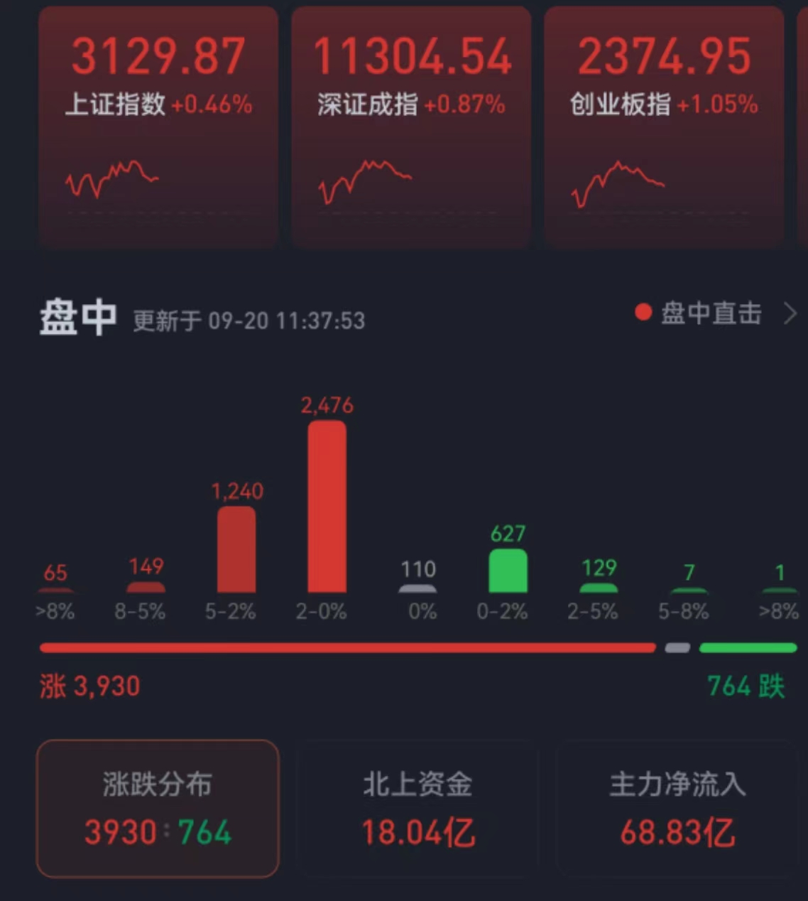 周二(9月20日),三大股指震蕩反彈,全線飄紅。截至上午收盤(pán),上證指數(shù)漲0.46%,報(bào)3129.87點(diǎn);深證成指和創(chuàng)業(yè)板指漲幅分別為0.87%和1.05%;滬深兩市合計(jì)成交額4213億元,總體來(lái)看,兩市個(gè)股漲多跌少,近4000只個(gè)股實(shí)現(xiàn)上漲。