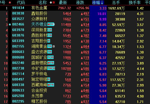 具體看,截至9月20日上午收盤(pán),有色金屬板塊漲幅居首,達(dá)3.33%。其中,鑫鉑股份、眾源新材等2只個(gè)股漲停,天齊鋰業(yè)和深圳新星等個(gè)股漲幅均超8%。