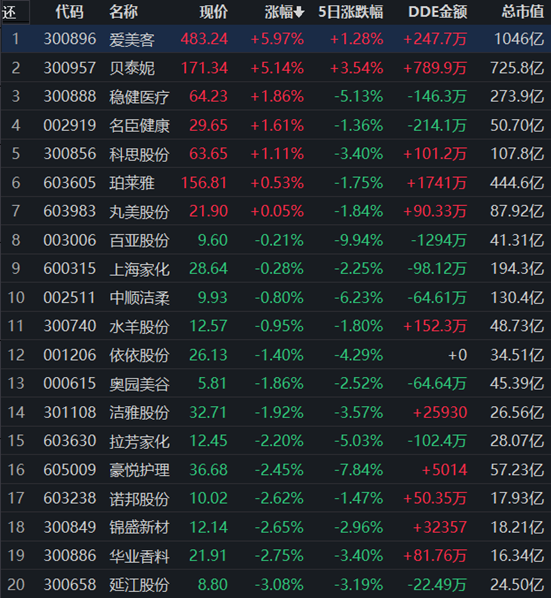9月26日,申萬一級行業(yè)中美容護(hù)理行業(yè)領(lǐng)漲,漲幅達(dá)2.02%。行業(yè)28只交易中的個股,有7只上漲,占比25%,其中,2只個股漲幅超5%。