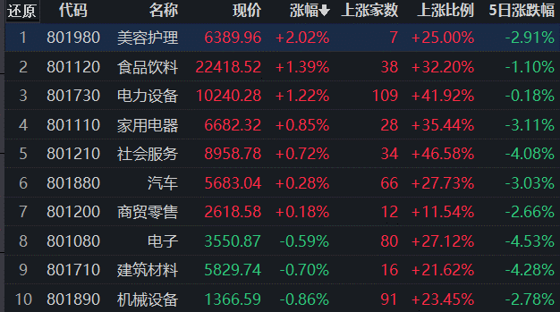 申萬一級行業(yè)方面,31類行業(yè)中有7類上漲,占比22.58%,其中,美容護(hù)理行業(yè)漲幅居前,達(dá)2.02%,食品飲料和電力設(shè)備分別以1.39%和1.22%排名第二與第三位;跌幅最大的是石油石化,跌幅為4.23%,此外,國防軍工、鋼鐵、煤炭和農(nóng)林牧漁等行業(yè)的跌幅也均超3%。