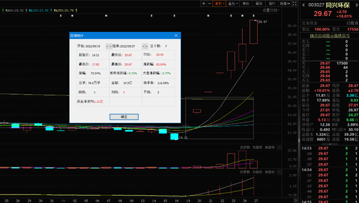 9月27日,同興環(huán)保漲10.01%,報29.67元。該股自9月19日以來,截至9月27日已連續(xù)7個交易日上漲,累計漲幅達(dá)83.04%,其中6個交易日漲停價報收。該股最新A股總市值達(dá)39.29億元,A股流通市值19.58億元。