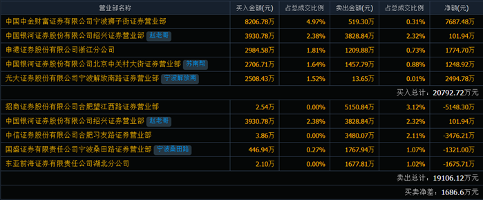 據(jù)同花順機構(gòu)成功率回測顯示,中國中金財富證券有限公司寧波獅子街證券營業(yè)部買入8206.78萬元,該營業(yè)部買入后,次日上漲概率46%,平均盈利-0.40%。收益率最高的是持股1天后賣出,收益率-0.40%,成功率46%。中國銀河證券股份有限公司紹興證券營業(yè)部買入3930.78萬元,該營業(yè)部買入后,次日上漲概率45%,平均盈利0.00%。收益率最高的是持股1天后賣出,收益率0.00%,成功率45%。