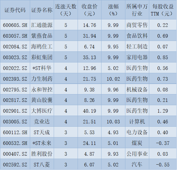 表:連續(xù)上漲3天且今日收盤漲停股一覽