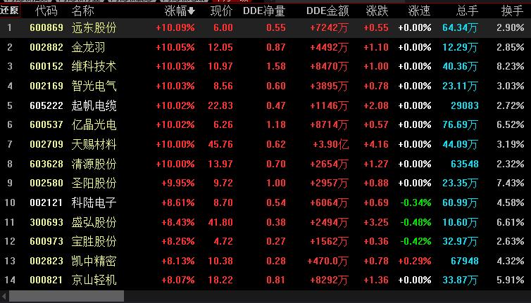 具體看,截至10月11日上午收盤,電力設(shè)備行業(yè)異動,漲幅居首達(dá)3.19%。其中,遠(yuǎn)東股份、金龍羽、維科技術(shù)等9只概念股集體漲停。