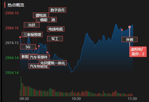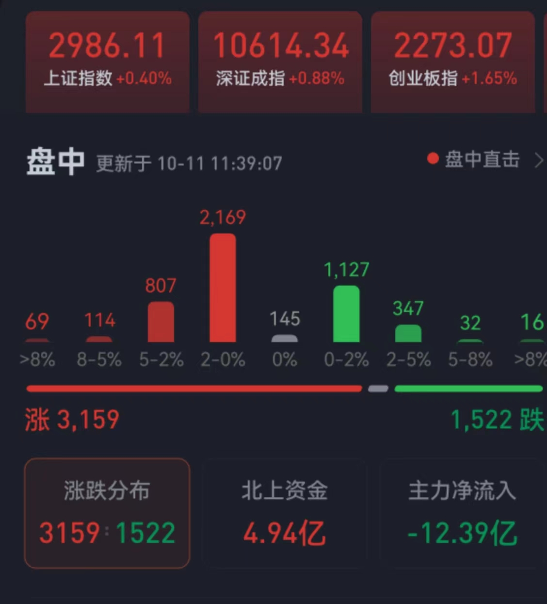 周二(10月11日),三大股指低開后震蕩走強,全線飄紅。截至上午收盤,上證指數(shù)上漲0.40%,報2986.11點;深證成指和創(chuàng)業(yè)板指漲幅分別為0.88%和1.65%;滬深兩市合計成交額3554.6億元,總體來看,兩市個股漲多跌少。