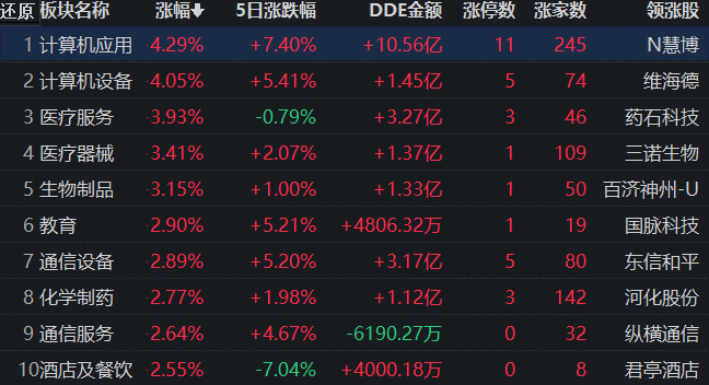 從漲幅居首的計算機應(yīng)用看,截至10月13日11:30,該行業(yè)交易的248只個股中,有245只上漲,其中71只漲幅超5%。從資金流向看,該行業(yè)今天上午大單資金凈流入額達(dá)10.56億元,居行業(yè)第1位。
