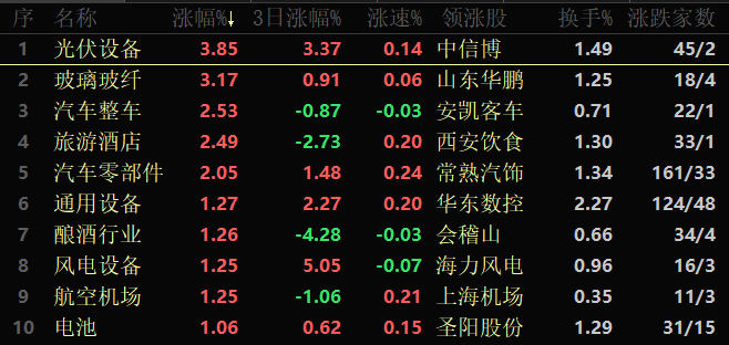 東方財富行業(yè)方面,截至10月25日11:30,86類行業(yè)中46類上漲,占比53.49%,其中,光伏設備行業(yè)漲幅達3.85%,排名首位,此外,玻璃玻纖行業(yè)漲幅也超3%。下跌的行業(yè)中,教育居首,跌幅達1.93%。